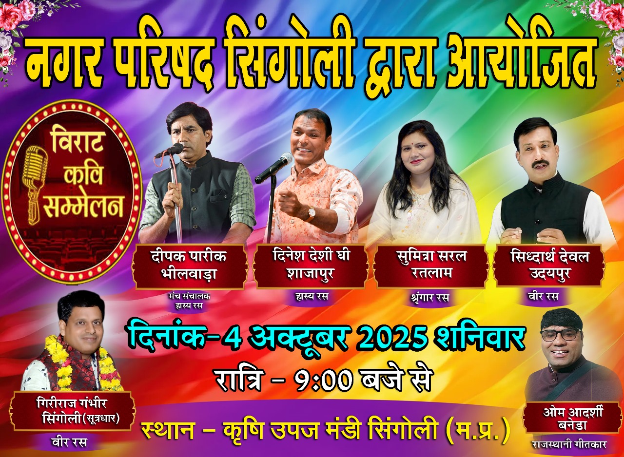 सिंगोली- नगर परिषद द्वारा आयोजित दशहरा उत्सव के तहत 4 अक्टूबर 2025 शनिवार रात्रि 9:00 बजे कृषि उपज मंडी तिलस्वा रोड पर एक विशाल कवि सम्मेलन का आयोजन किया जा रहा है | जिसमें ख्यातनाम कवि काव्यपाठ करेंगे | जिसमें मंच संचालक लोकप्रिय हास्य कवि दीपक पारीक भीलवाड़ा अंतर्राष्ट्रीय हास्य कवि दिनेश देशी घी शाजापुर श्रृंगार की सुप्रसिद्ध कवयित्री सुमित्रा सरल रतलाम वीर रस मेवाड़ के ओजस्वी कवि सिद्धार्थ देवल उदयपुर राजस्थानी हास्य गीतकार कवि ओम आदर्शी बनेड़ा और नगर के युवा कवि गिरीराज गंभीर काव्यपाठ करेंगे | नगर परिषद मेला समिति ने समस्त काव्य प्रेमी जनता नागरिकगण और क्षेत्रवासी अधिक से अधिक संख्या में पधारकर कवि सम्मेलन का आनंद ले एवं कार्यक्रम को सफल बनाएँ |